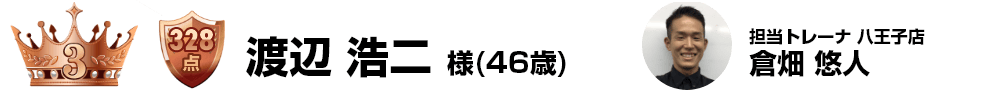 渡辺様はアウトラインが素晴らしく特に三角筋や大腿四頭筋が印象的でした。何よりポージングでの筋肉の見せ方や圧倒させる演出に魅了されました。当日まで沢山の練習をされたのが見受けられたのが入賞の決め手となりました。