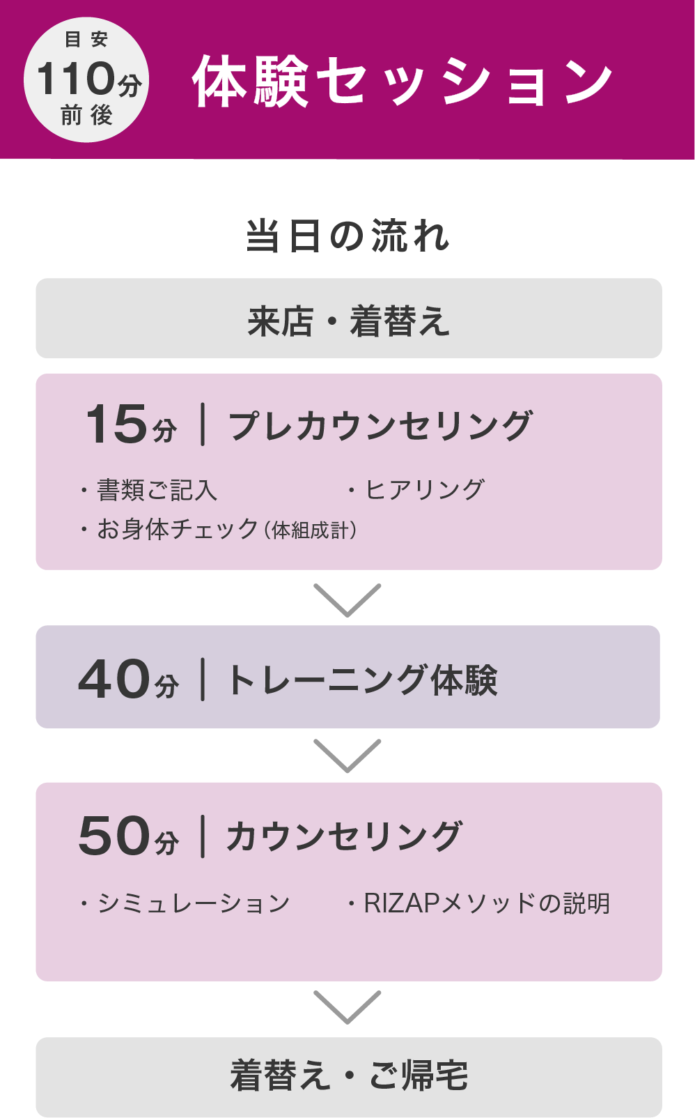 - 当日は、トレーニングとカウンセリングをセットでお受けいただき、所要時間は110分となります。
