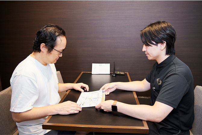 無料カウンセリングは、カウンセリングシートの記入からスタートしました。身長や体重、血圧といった基本的な情報に加えて、運動歴やアレルギーの有無、現在治療中の病気の有無、現在の悩みなどの情報も記入し、その情報をもとにトレーナーがヒアリングします。
