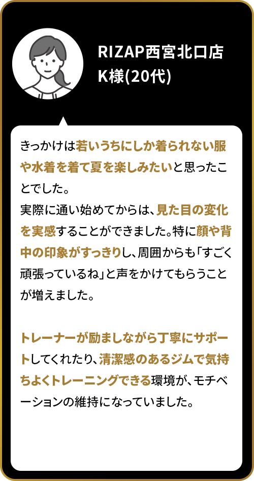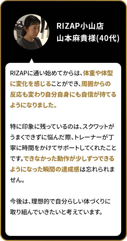 ※体験者(はねちかさん)の体脂肪数値・ウエスト数値はRIZAPの統計データを上回ったものであり、誰もがこの結果を得られるものではありません。※体験者(はねちかさん)の年齢はウエスト数値のエビデンス統計の範囲外です。※結果には個人差があり効果を保証するものではありません。※プログラム実施期間は2ヶ月間になります。※RIZAPの臨床試験結果はこちら