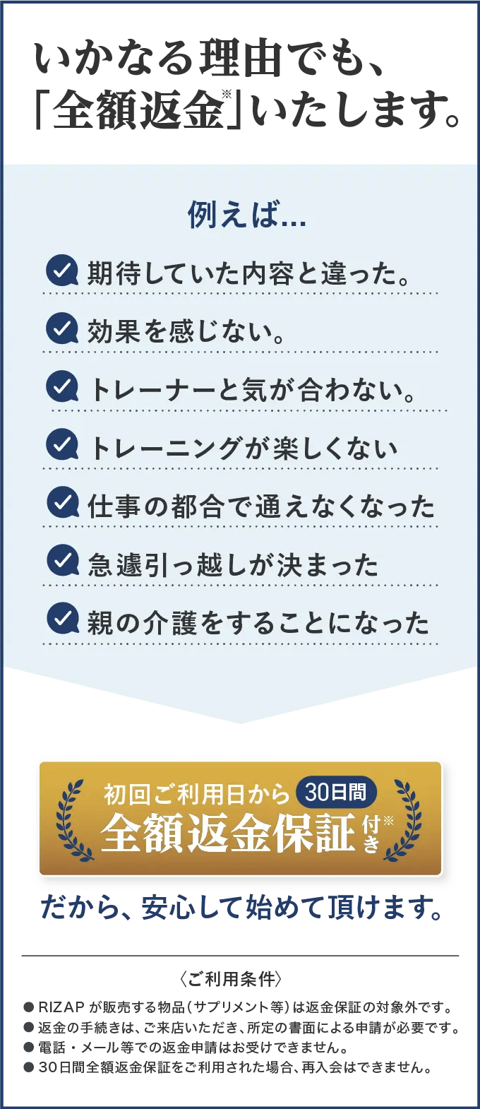 ※入会時に契約したコースの初回のご利用日から30日間。ただし、RIZAPにて販売する物品は対象外となります。返金の手続きは来店の上書面で行うものとし、電話、メールなどの手段による手続きには応じかねます。30日間全額返金保証を利用すると再入会できません。