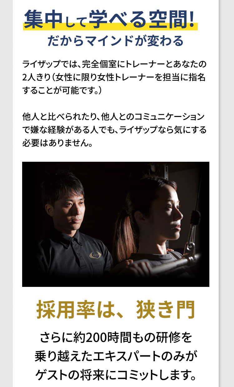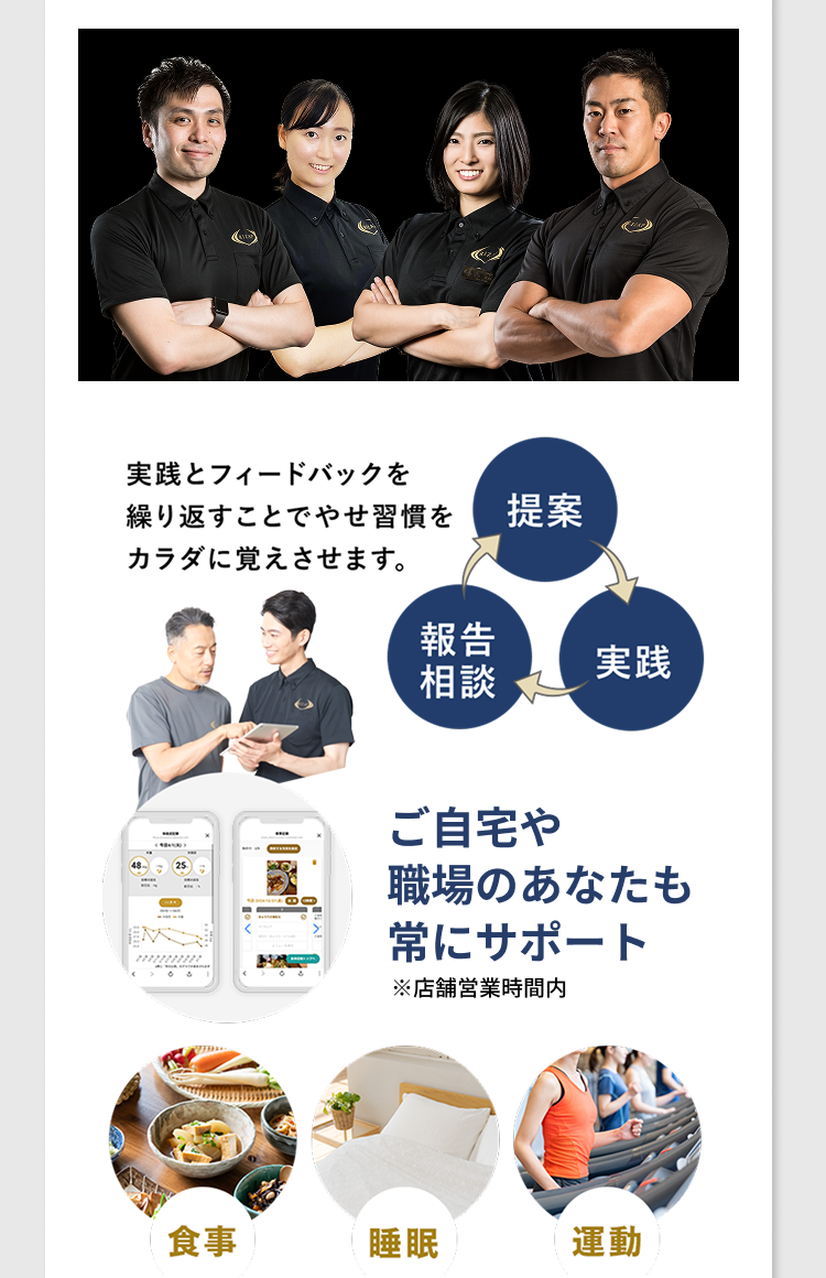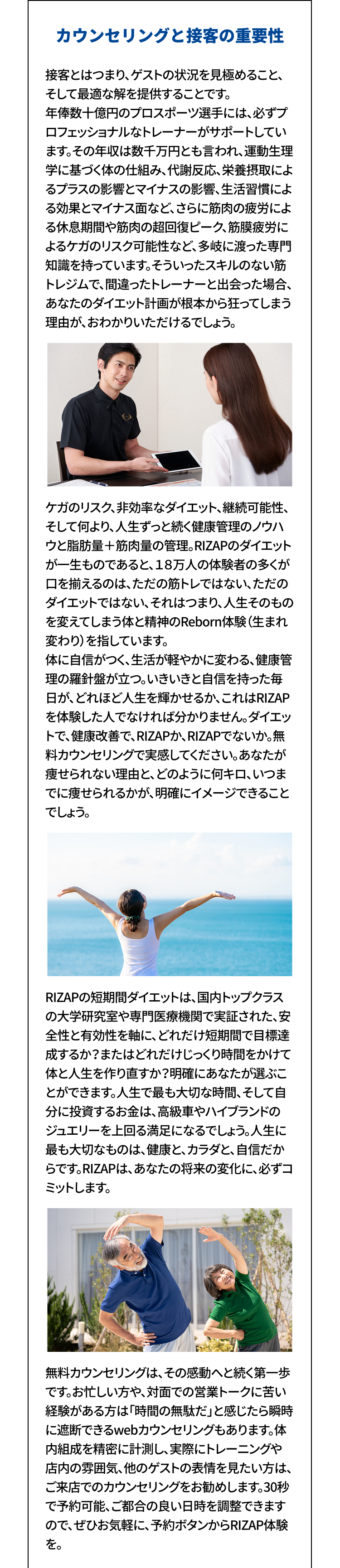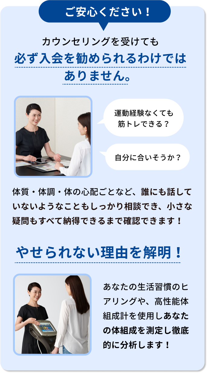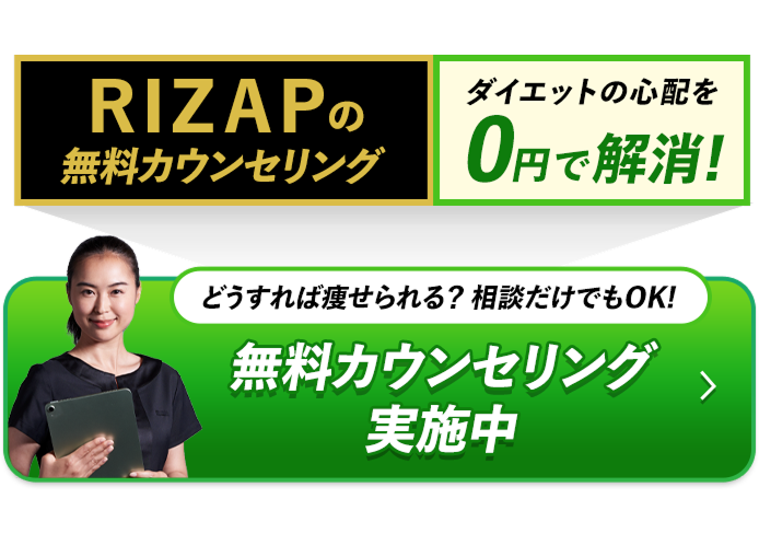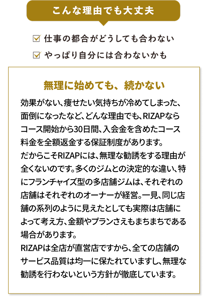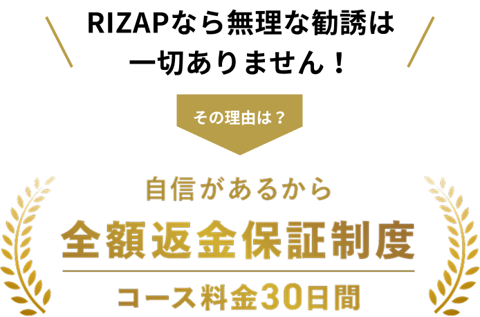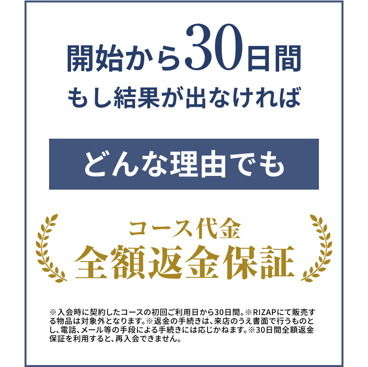 ※入会時に契約したコースの初回ご利用日から30日間。※RIZAPにて販売する物品は対象外となります。※返金の手続きは、来店のうえ書面で行うものとし、電話、メール等の手段による手続きには応じかねます。※30日間全額返金保証を利用すると、再入会できません。