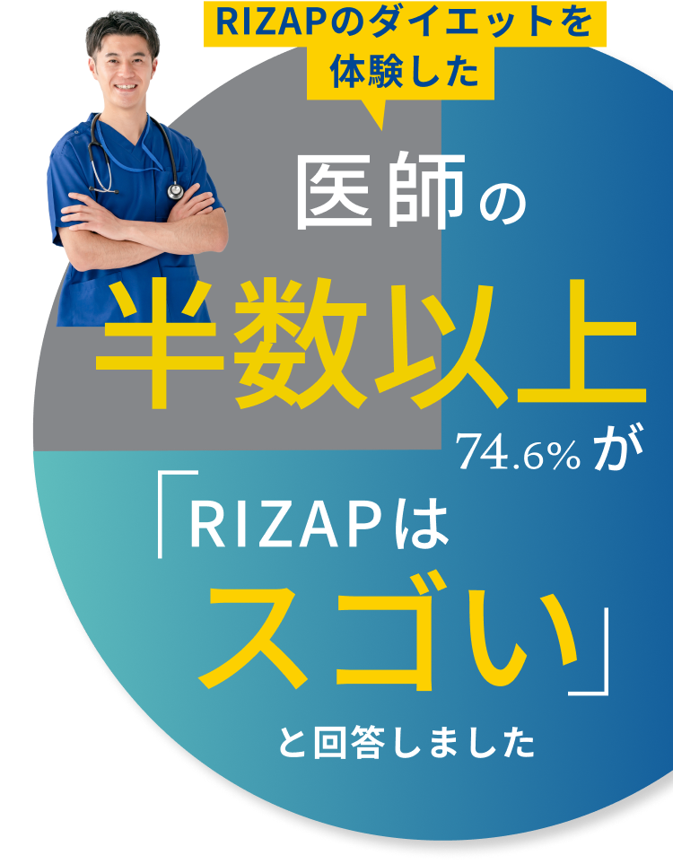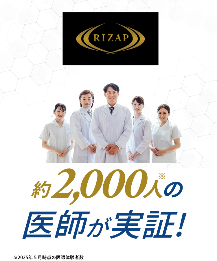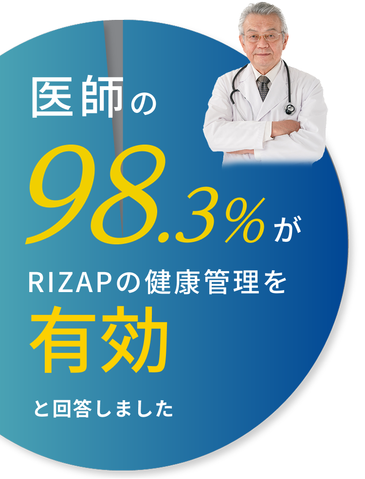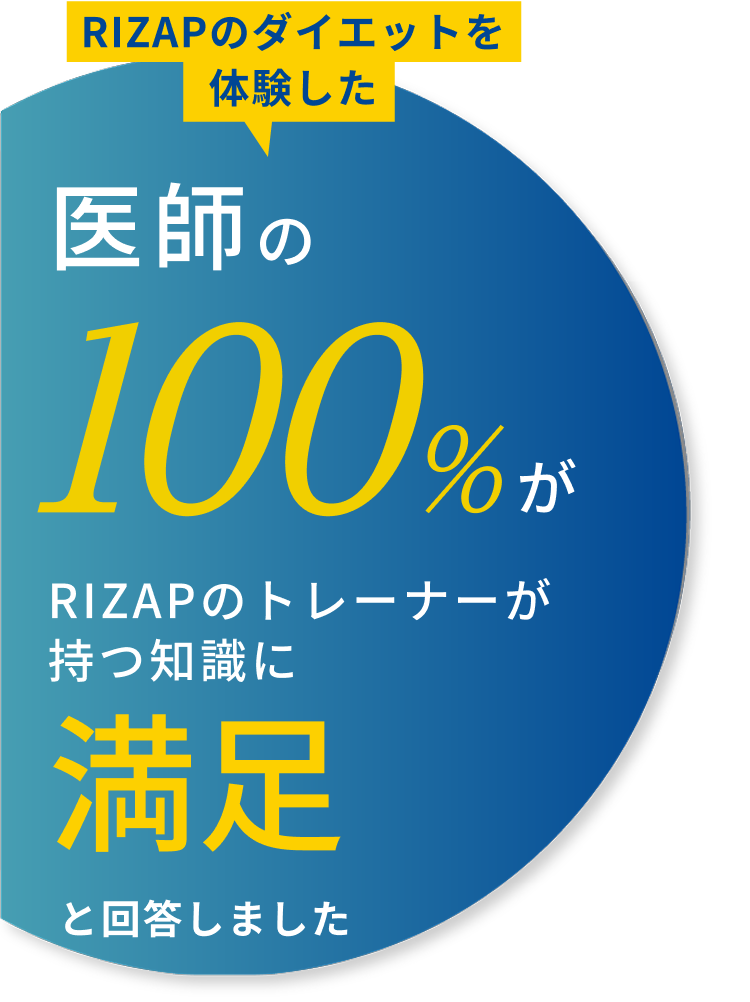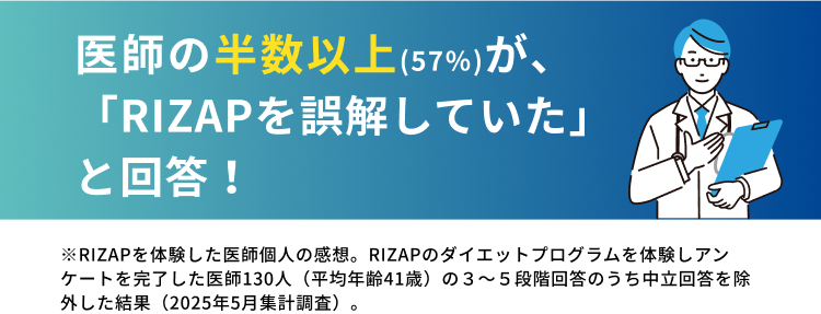 ※RIZAPを体験した医師個人の感想。RIZAPのダイエットプログラムを体験しアンケートを完了した医師130人(平均年齢41歳)の3〜5段階回答のうち中立回答を除外した結果(2025年5月集計調査)。
