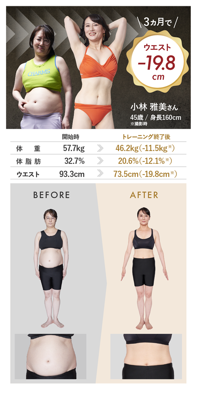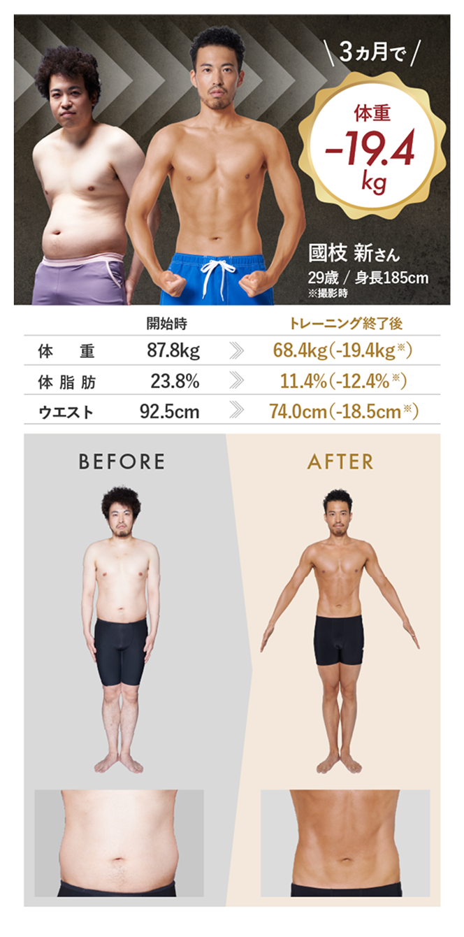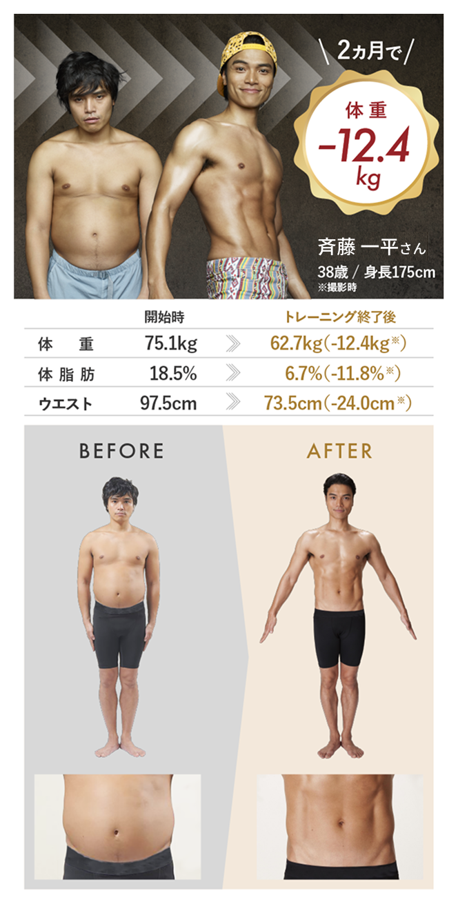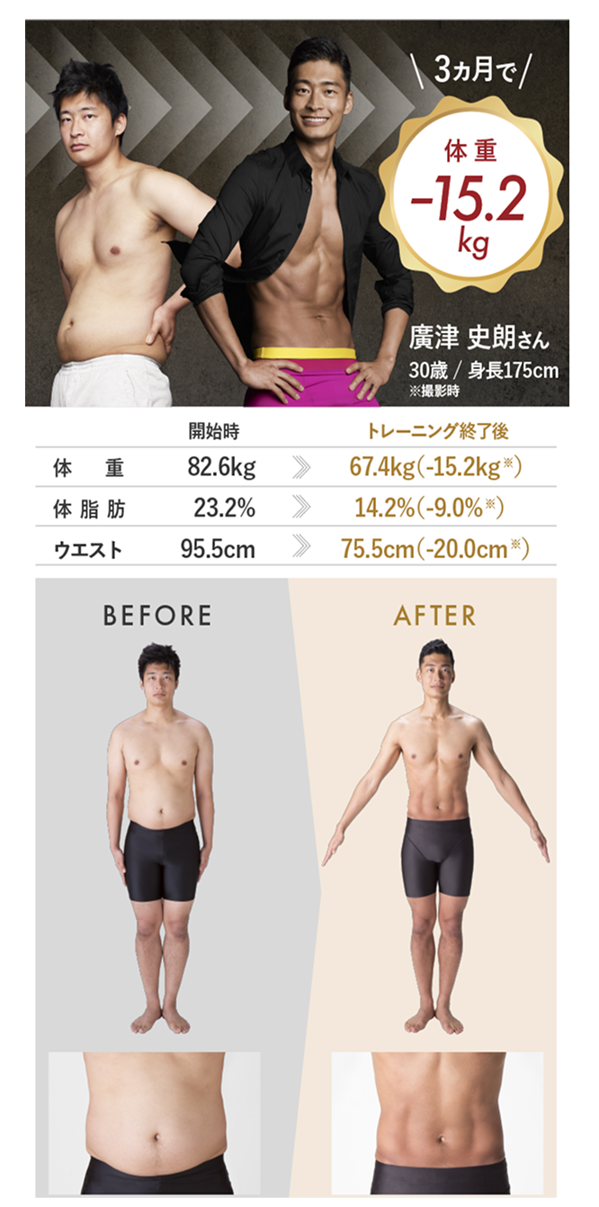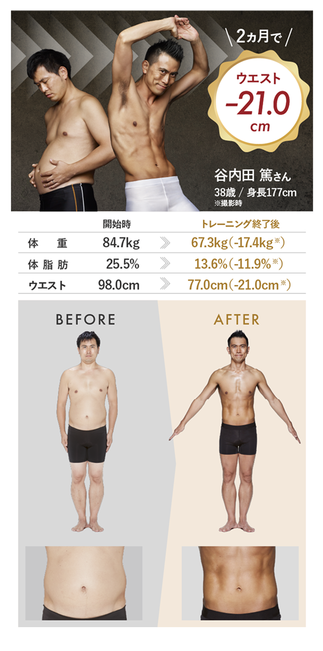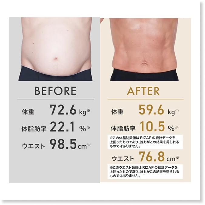 ※体験者(ジャン・裕一さん)の体脂肪数値・ウエスト数値はRIZAPの統計データを上回ったものであり、誰もがこの結果を得られるものではありません。※結果には個人差があり効果を保証するものではありません。※プログラム実施期間は2ヶ月間になります。RIZAPの臨床試験結果はこちら