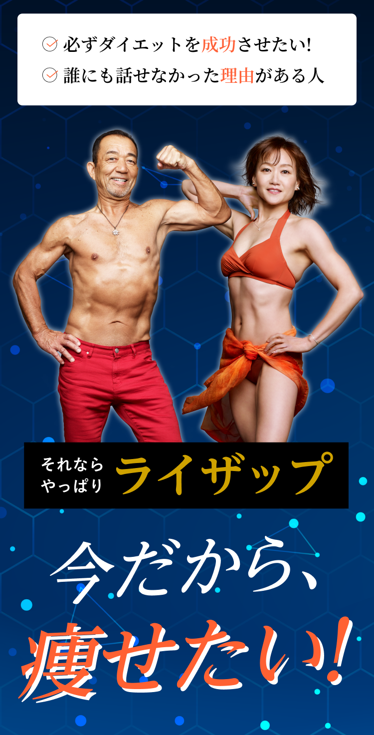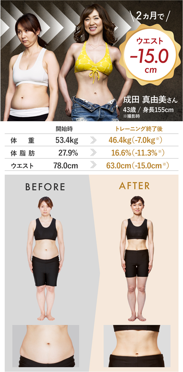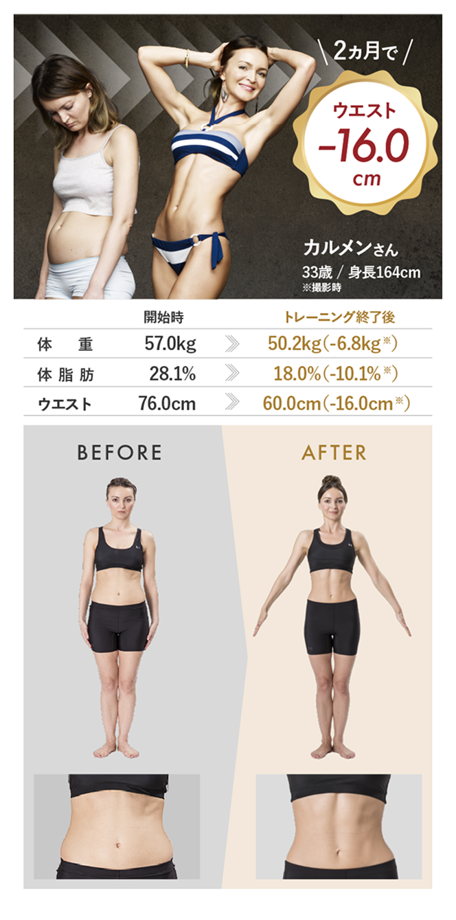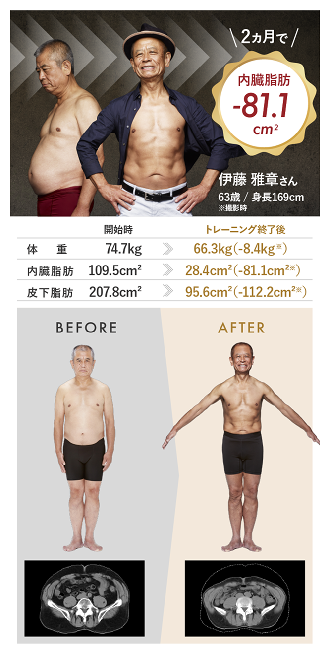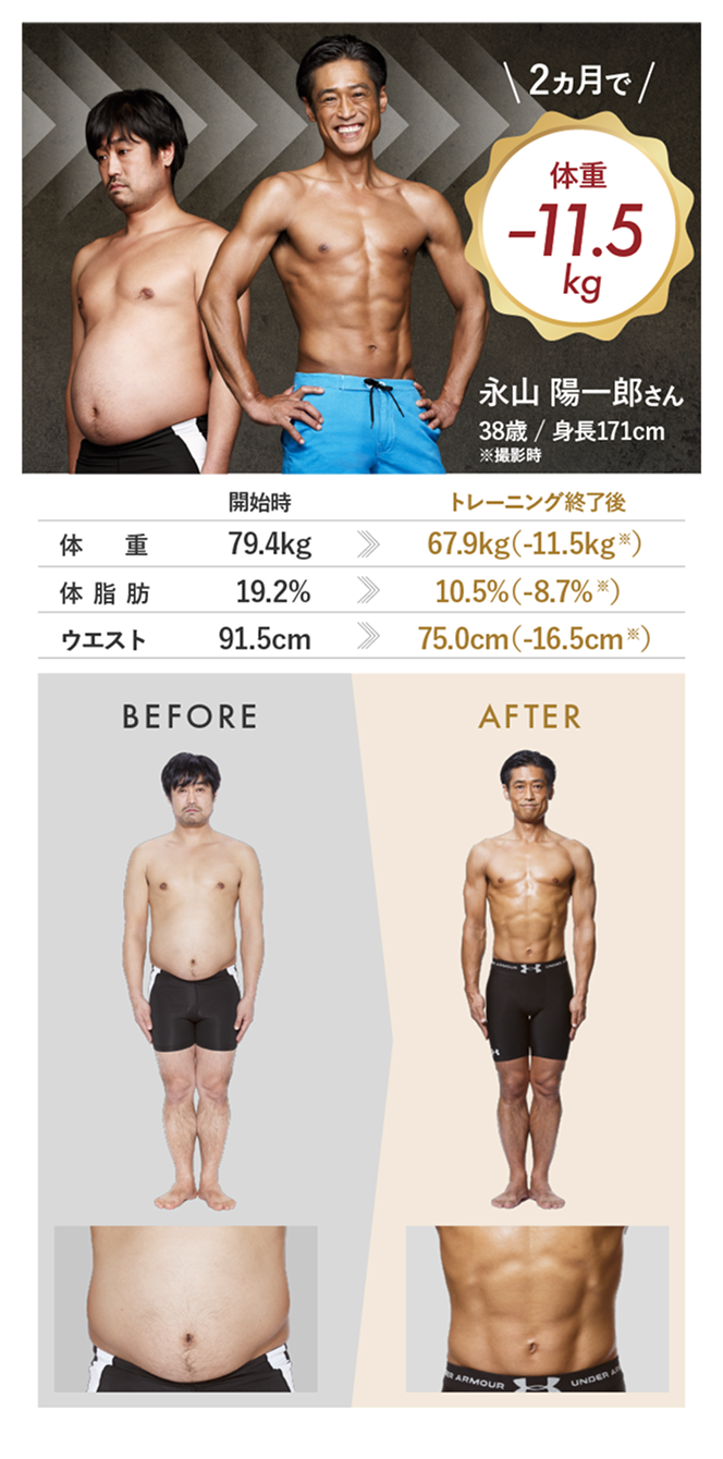 ※体験者(ジャン・裕一さん)の体脂肪数値・ウエスト数値はRIZAPの統計データを上回ったものであり、誰もがこの結果を得られるものではありません。※結果には個人差があり効果を保証するものではありません。※プログラム実施期間は2ヶ月間になります。RIZAPの臨床試験結果はこちら
