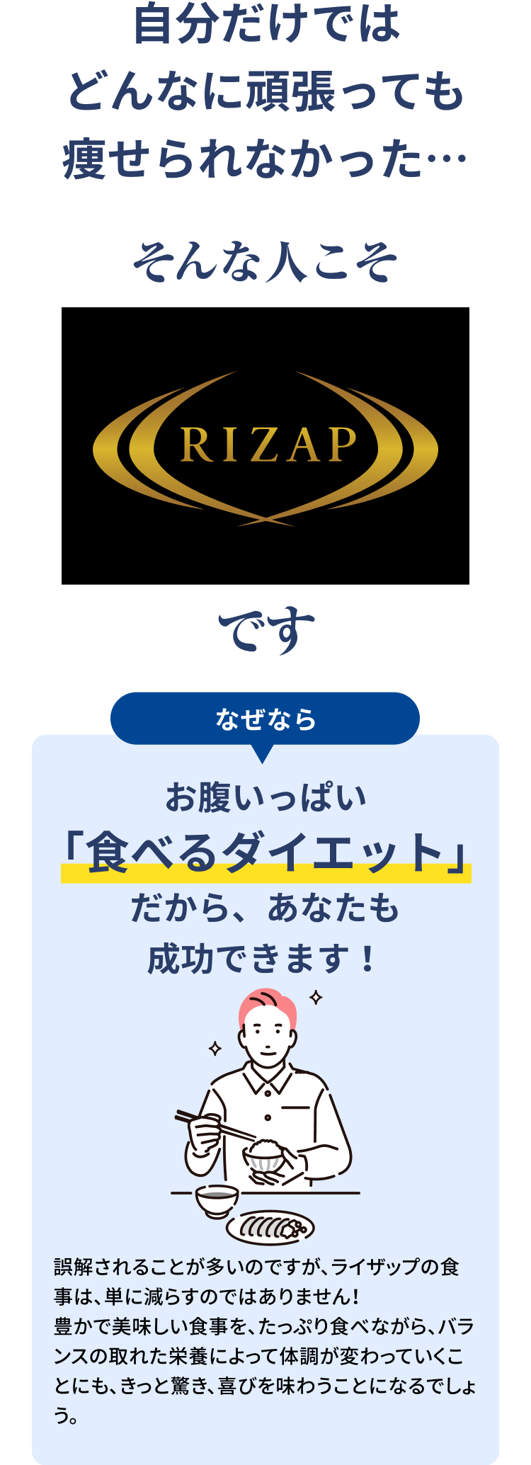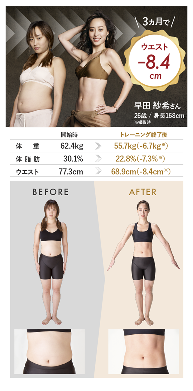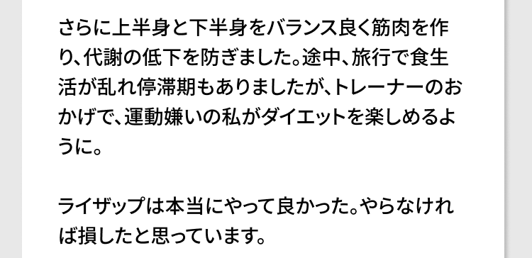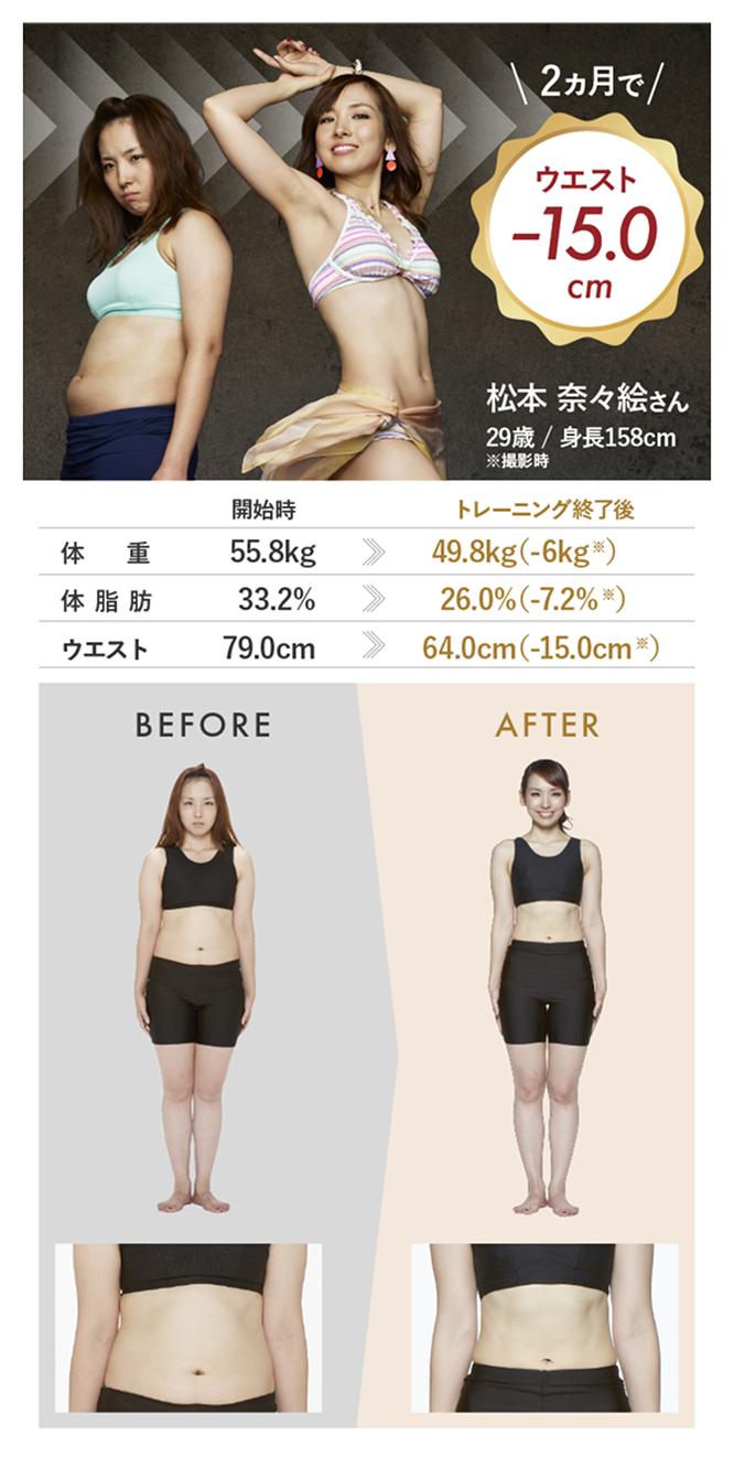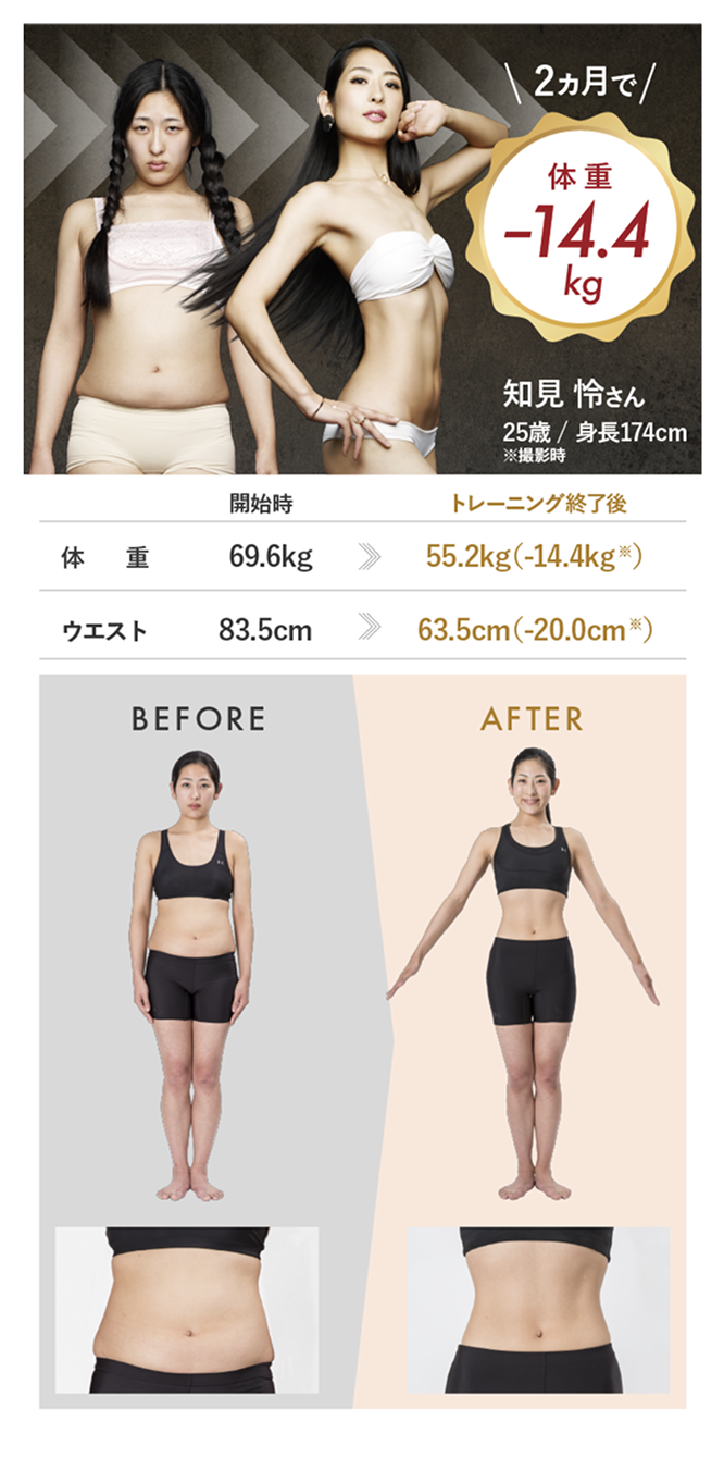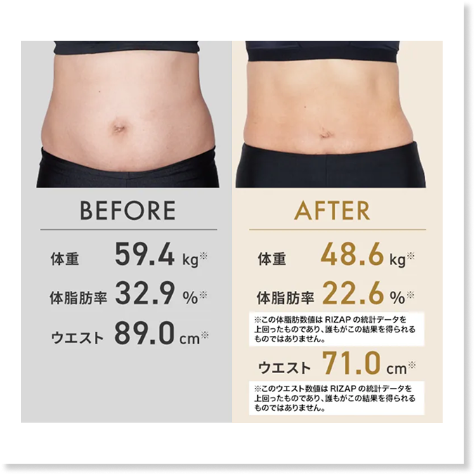 ※体験者(はねちかさん)の体脂肪数値・ウエスト数値はRIZAPの統計データを上回ったものであり、誰もがこの結果を得られるものではありません。※体験者(はねちかさん)の年齢はウエスト数値のエビデンス統計の範囲外です。※結果には個人差があり効果を保証するものではありません。※プログラム実施期間は2ヶ月間になります。 RIZAPの臨床試験結果はこちら