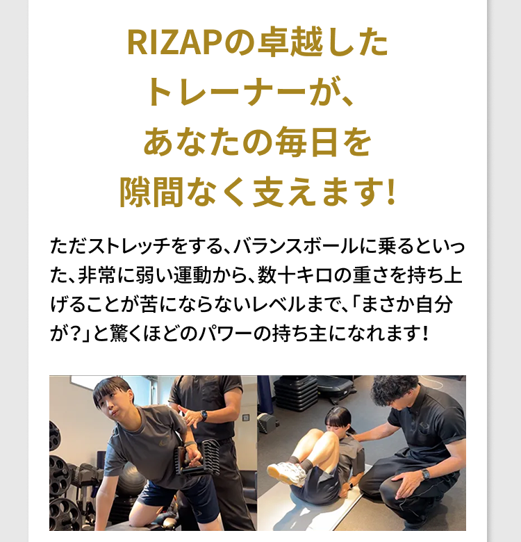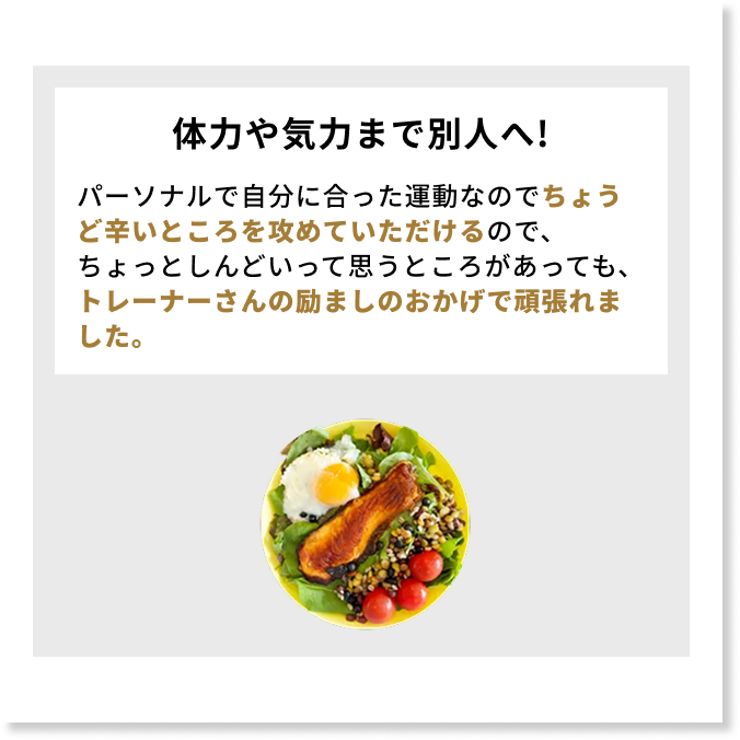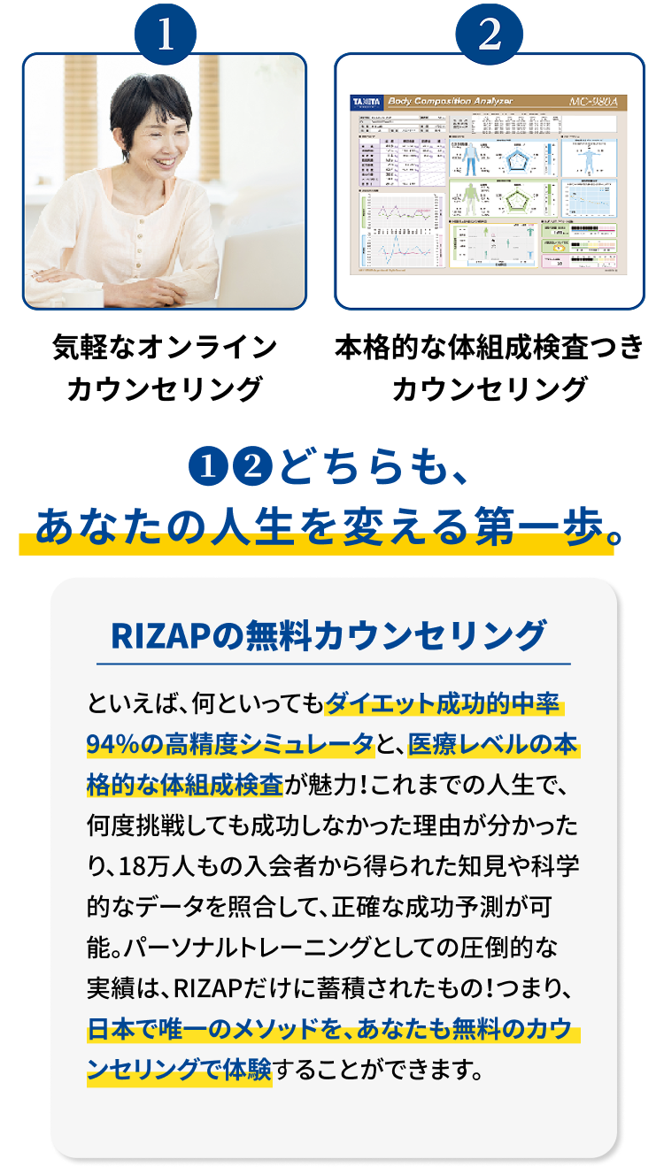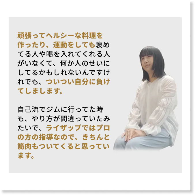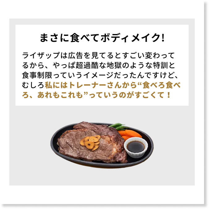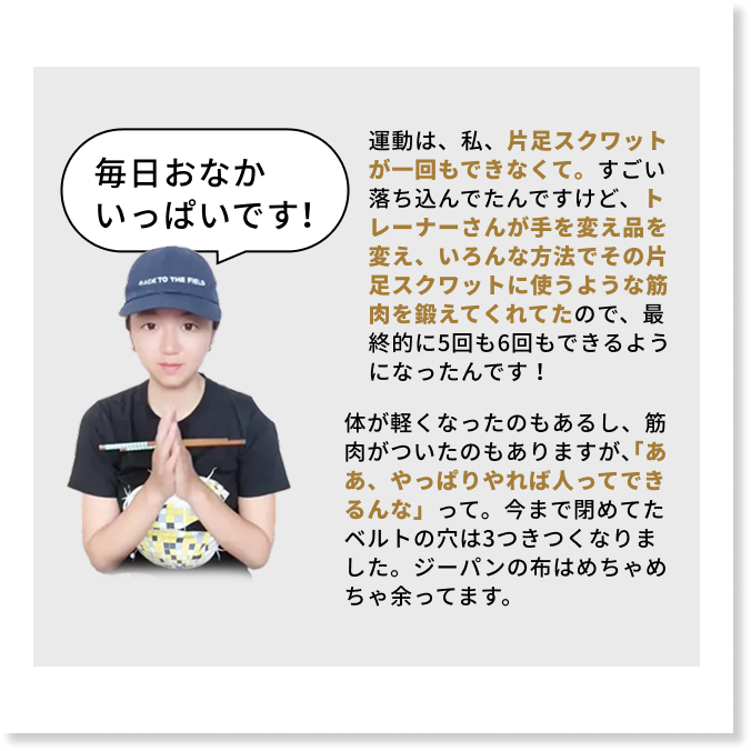 ※体験者(はねちかさん)の体脂肪数値・ウエスト数値はRIZAPの統計データを上回ったものであり、誰もがこの結果を得られるものではありません。※体験者(はねちかさん)の年齢はウエスト数値のエビデンス統計の範囲外です。※結果には個人差があり効果を保証するものではありません。※プログラム実施期間は2ヶ月間になります。 RIZAPの臨床試験結果はこちら