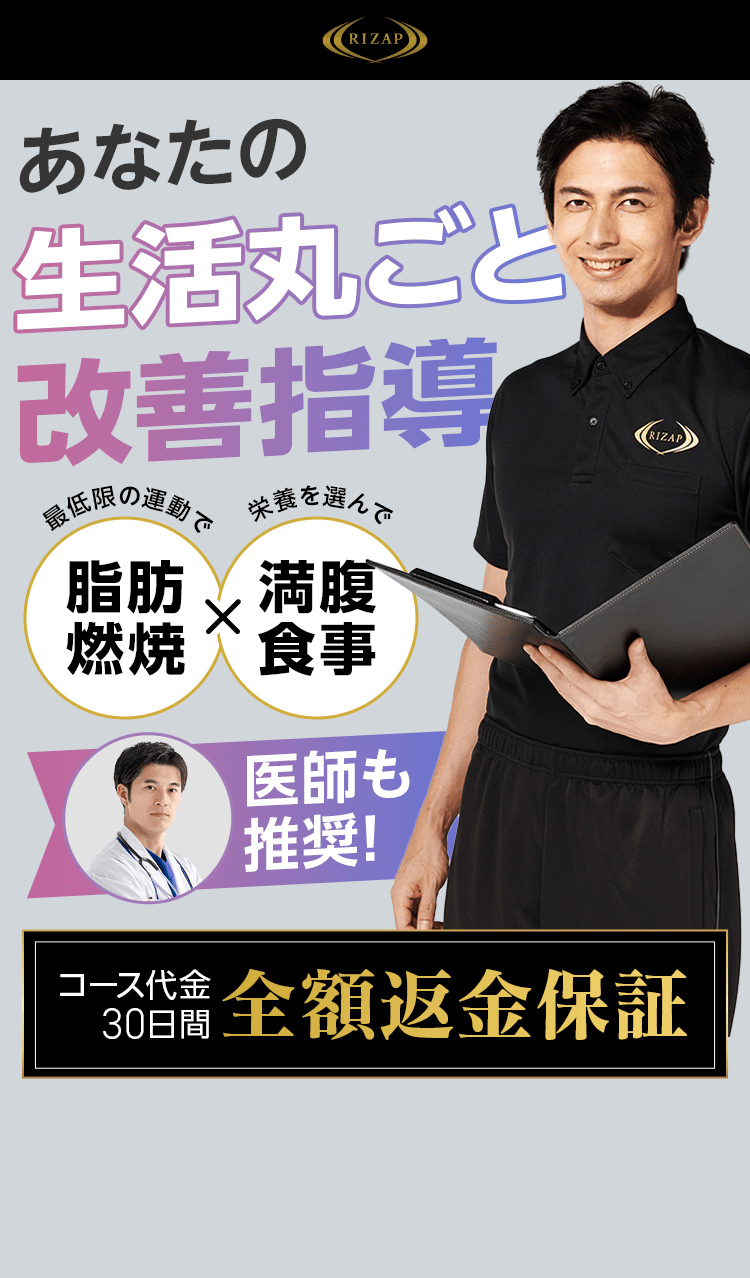 ※入会時に契約したコースの初回ご利用日から30日間。※RIZAPにて販売する物品は対象外となります。※返金の手続きは、来店のうえ書面で行うものとし、電話、メール等の手段による手続きには応じかねます。※30日間全額返金保証を利用すると、再入会できません。