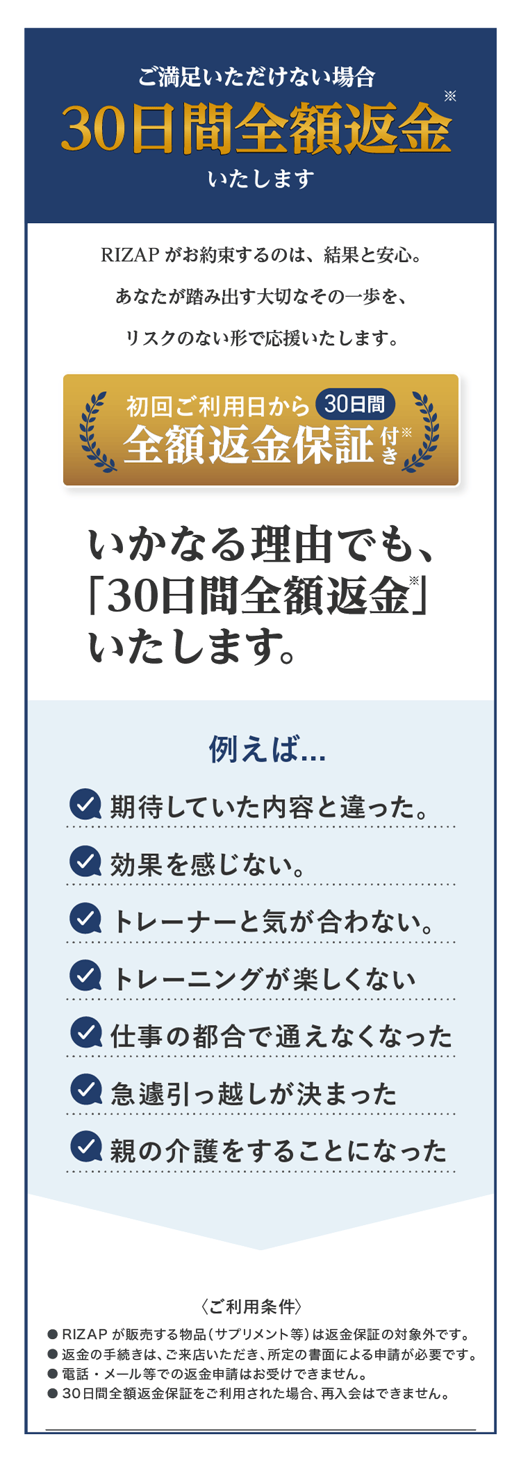 ※入会時に契約したコースの初回のご利用日から30日間。ただし、RIZAPにて販売する物品は対象外となります。返金の手続きは来店の上書面で行うものとし、電話、メールなどの手段による手続きには応じかねます。30日間全額返金保証を利用すると再入会できません。
