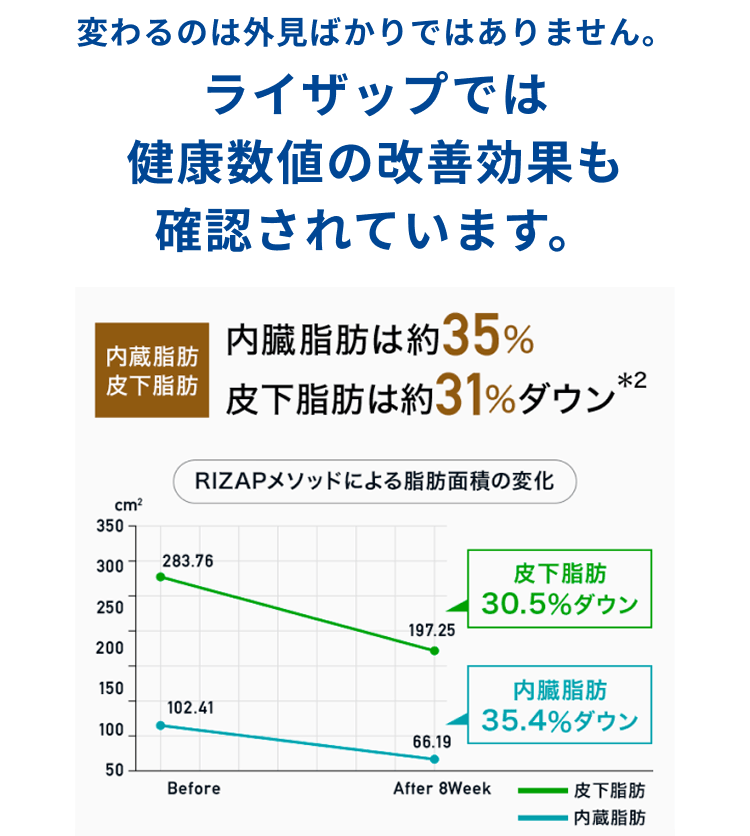 ※RIZAPのプログラム体験者N=46(24~66歳、平均年齢45.8±10.9歳)の数値を統計処理した結果、皮下脂肪面積が2ヶ月間で326.63㎠