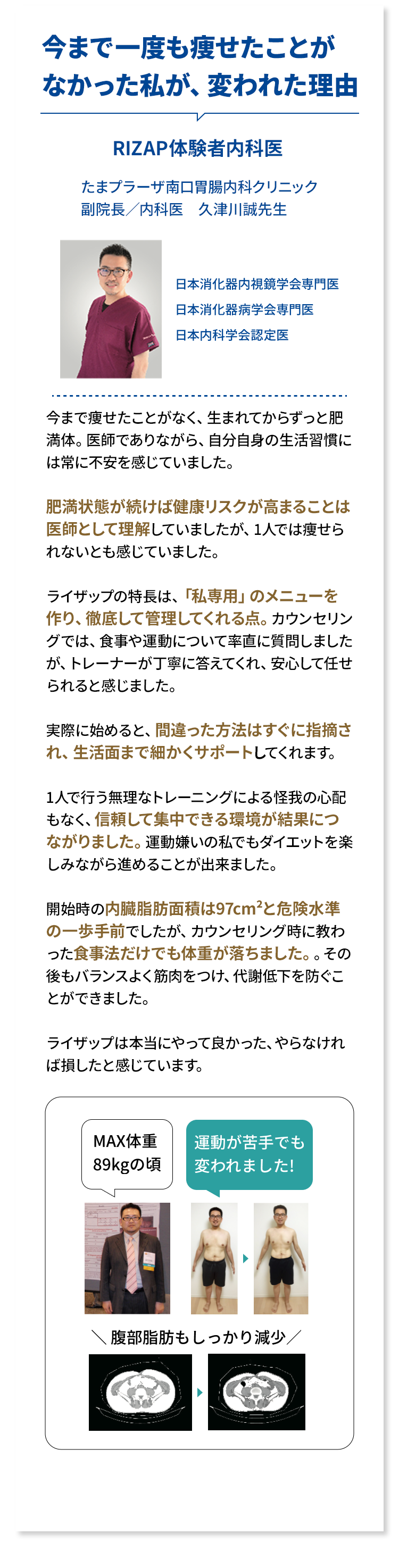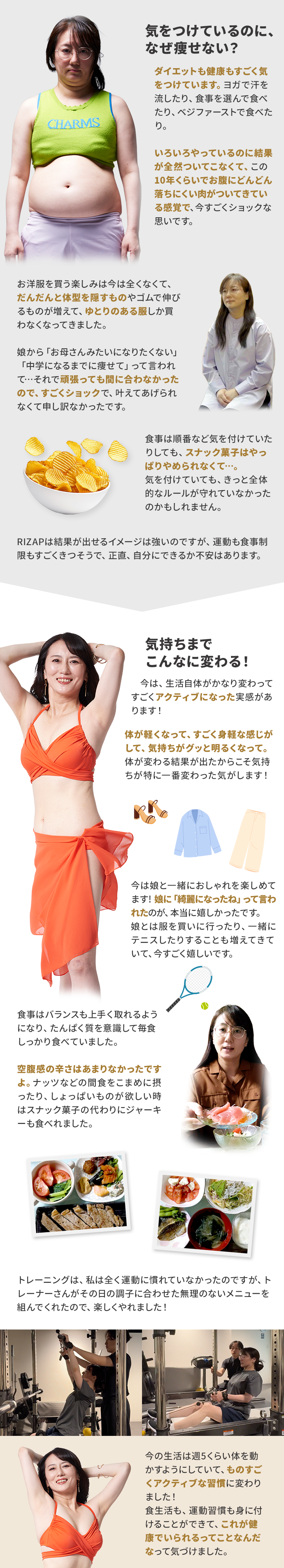 ※体験者(ジャン・裕一さん)の体脂肪数値・ウエスト数値はRIZAPの統計データを上回ったものであり、誰もがこの結果を得られるものではありません。※結果には個人差があり効果を保証するものではありません。※プログラム実施期間は2ヶ月間になります。※RIZAPの臨床試験結果はこちら