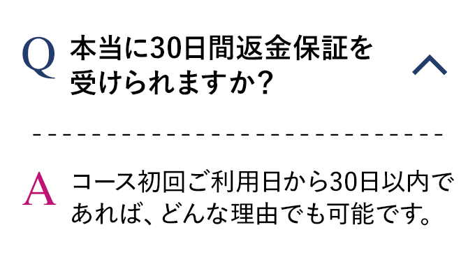 ※入会時に契約したコースの初回のご利用日から30日間。ただし、RIZAPにて販売する物品は対象外となります。返金の手続きは来店の上書面で行うものとし、電話、メールなどの手段による手続きには応じかねます。30日間全額返金保証を利用すると再入会できません。